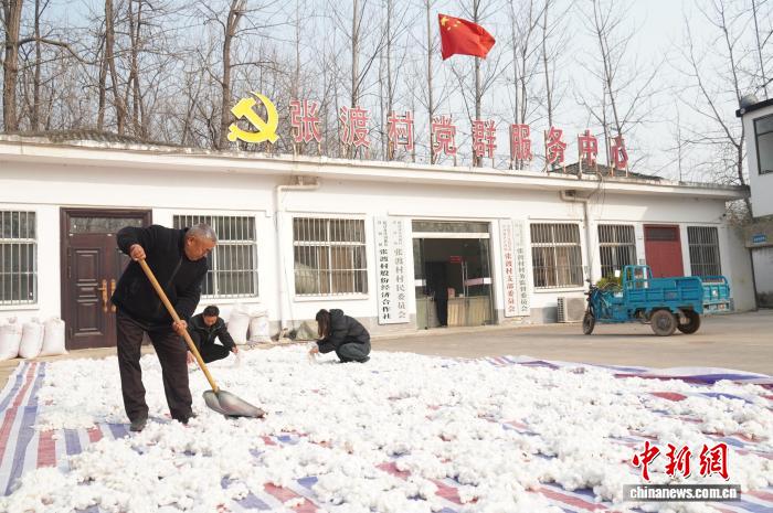 中新网宿迁12月29日电 (刘林 谷华 李雯霄)冬至过后,天气日渐寒冷,但江苏省宿迁市洋河新区洋河镇张渡村党群服务中心门前却暖意融融。阳光下,满地雪白的棉花蓬松柔软,几名村居工作者正娴熟地翻动、整理棉絮,空气中弥漫着淡淡的棉香。这些棉花正是张渡村与宿迁市农业科学研究院携手探索的棉花大豆带状复合种植模式结出的成果。