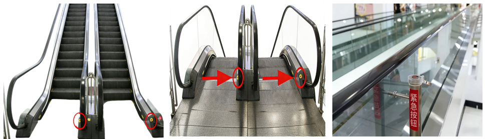 紧急制动按钮通常设在手扶电梯的两端,常位于踏板附近、扶手侧下方等处,部分长距离扶梯也会在中段设置,通常为一个红色(偶见黄色)的圆形按钮。
