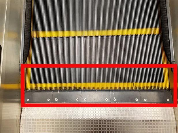 梳齿板是自动扶梯的重要安全装置,可避免梯级上的异物卷入扶梯内部,但一定要小心梳齿板接合处的缝隙。切勿让手、脚、衣服下摆等靠近该缝隙,以防发生夹卷事故。