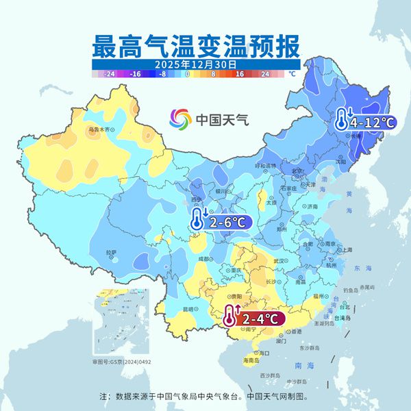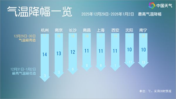 像哈尔滨,昨天最高气温-1.4℃,今后三天气温持续走低,31日最高气温仅有-19℃。杭州今天最高气温超过18℃,1月1日最高气温跌至3℃。
