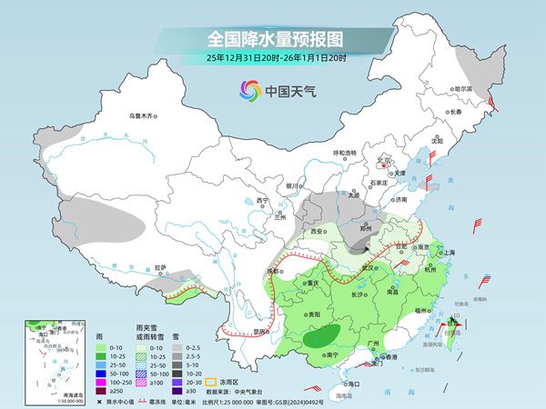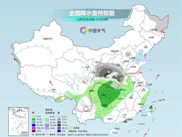 冷空气接连不断的同时,南支槽明天也将发展加强,冷暖气流相遇,2025年12月30日夜间至2026年1月1日早晨,黄河以南将迎来一次大范围雨雪天气过程。