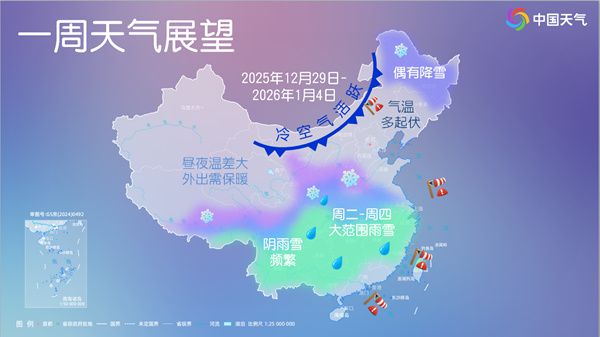 导读:本周,两股冷空气将接连来袭,跨年冷空气实力更强,中东部大部地区气温将刷新今冬以来新低。降温的同时,黄河以南大范围雨雪来袭。