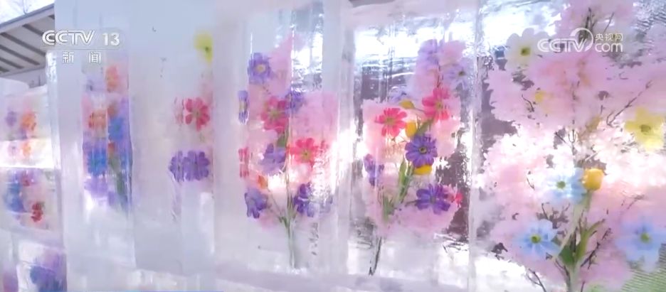 看完了雾凇,刚才说到的冰雕在哪里呢?大家看这面鲜花冰墙就是进入冰雕观赏区的标志:它以冰块为载体,嵌入了青海本土的郁金香、格桑花,还有西宁市花丁香花,娇艳色彩与冰晶的纯净相互映衬。