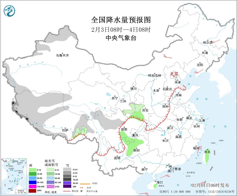2月3日08时至4日08时,新疆北疆北部和南疆西部山区、西藏西部和南部、青海南部、甘肃南部等地部分地区有小雪或雨夹雪,其中,西藏西部局地有中到大雪(5~9毫米)。西藏东南部、陕西南部、四川盆地东部和西部、贵州西部、台湾岛等地部分地区有小雨。内蒙古中东部、黑龙江南部、辽东半岛等地部分地区有4~5级风。