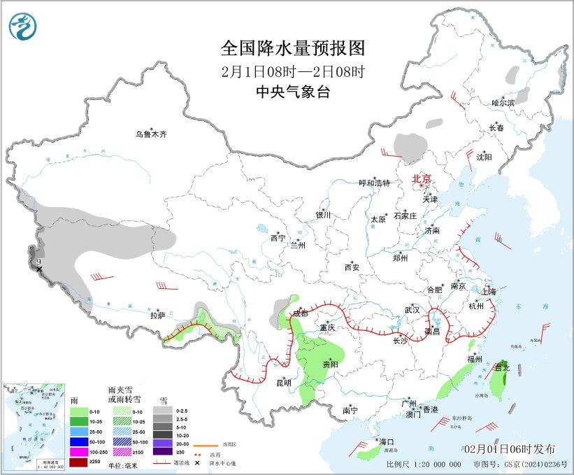 2月1日08时至2日08时,内蒙古中东部、新疆南疆西部山区、西藏西部和北部、青海西南部等地部分地区有小雪或雨夹雪,其中,西藏西部等地部分地区有中到大雪(5~9毫米)。西藏东南部、贵州中西部、云南东部、福建东南部、广东东部沿海、海南岛、台湾岛等地部分地区有小到中雨。内蒙古中东部、辽东半岛、河北北部、山东半岛等地部分地区有4~5级风。