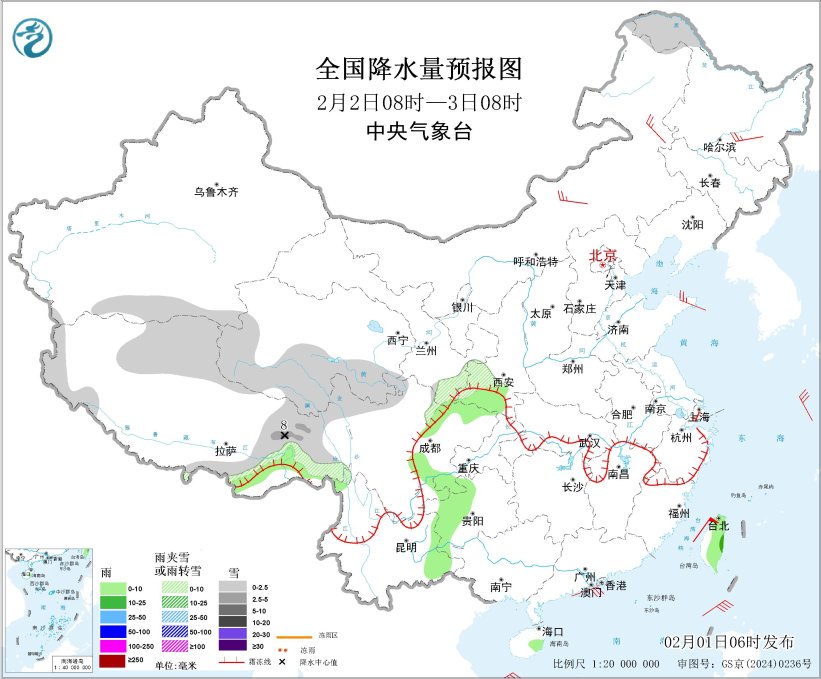 2月2日08时至3日08时,黑龙江西北部、新疆南疆南部、西藏西部和东部、青海南部、甘肃南部、川西高原北部等地部分地区有小雪或雨夹雪,其中,西藏东部等地部分地区有中到大雪(5~8毫米)。西藏东南部、陕西南部、四川盆地东部和西部、贵州西部、台湾岛大部等地部分地区有小到中雨。内蒙古中东部、黑龙江南部、山东半岛等地部分地区有4~5级风。