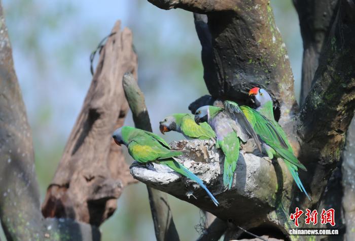 “饮水槽吸引成群结队的大紫胸鹦鹉前来饮水、嬉戏;巢穴也发挥了作用,成功吸引大紫胸鹦鹉、鹊鸲等鸟前来繁殖。”卢文介绍,今年1月统计发现,大紫胸鹦鹉数量已超300只,随即又增加了18个人工巢穴。
