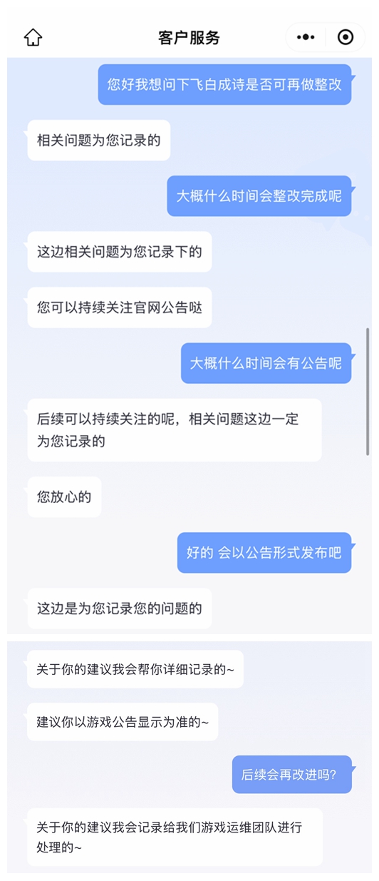 12月30日,记者向《燕云十六声》客服咨询该情况,对方询问了记者在游戏内的ID角色编码并表示会详细记录问题。针对何时会对“飞白成诗”进行整改这一问题,客服回应道:相关建议会记录给游戏运维团队进行处理,后续可持续关注官网公告。
