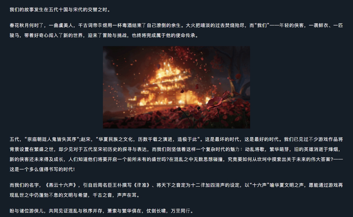 《燕云十六声》网站关于游戏的介绍描述中写道:故事发生在五代十国与宋代的交替之时。《燕云十六声》,引自后周名臣王朴撰写《律准》、将天下之音定为十二律加四清声的设定,以“十六声”喻华夏文明之声,愿能通过游戏再现乱世之中仍蓬勃不息的文明与希望。天眼查App显示,网易(杭州)网络有限公司已经为“燕云十六声”申请商标注册,国际分类涉及教育娱乐、通讯服务等。