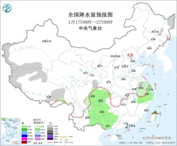 2025年12月31日08时至2026年1月1日08时,黑龙江东北部、新疆南疆西部山区、西北地区东部、山西南部、黄淮西部、江淮西部、江汉等地部分地区有小到中雪或雨夹雪,其中,甘肃东部、陕西中南部、山西西南部、河南中西部和南部等地部分地区有大到暴雪(10~15毫米)。江南大部、西南地区东部、华南西部等地部分地区有小到中雨,其中,湖南北部、广西西部、台湾岛北部等地部分地区有大雨。新疆北部、内蒙古东部、青海南部部分地区有4~6级风。东海大部海域、台湾海峡、台湾以东洋面、南海东北部海域将有6~8级、阵风9级的东北风。