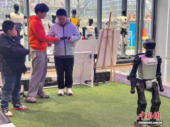 武汉光谷人形机器人7S店也成了市民游客的“打卡地”,日均接待顾客约5000人次。店内最热门的要数AI下棋、机器人踢足球和体感竞技等互动项目,很多外地家长带着孩子来体验,每个项目排队超过半小时。