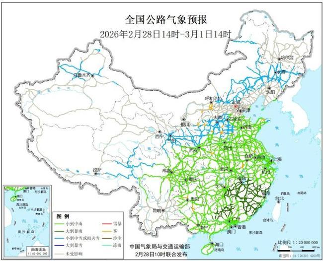 预计2月28日14时至3月1日14时,北京北部、河北北部和西南部、山西中南部、内蒙古中东部、吉林大部、辽宁西部、陕西中北部、甘肃南部、宁夏南部、青海南部、西藏东部、川西高原北部、新疆北部等地部分道路受降雪或雨夹雪影响,发生道路湿滑、结冰的风险较高;河北南部、山东大部、河南中部、甘肃南部、陕西中南部、江淮、江南、华南、西南东部和北部等地部分道路受降雨影响,广西东北部、广东北部、江西中南部、湖南东部、福建大部等地局地受大雨或暴雨影响,发生道路湿滑、积水的风险较高;山西中部、内蒙古南部、山东东北部、河南西南部、江苏中部、安徽西部、广西中部、四川中部、贵州中部、陕西北部等地部分道路需防范低能见度对交通出行的影响(见图3)。