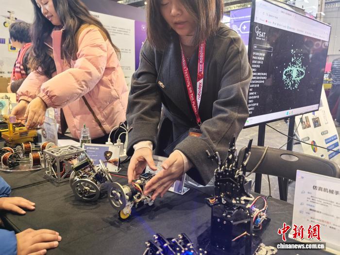 航天创新教育展台吸引众多孩子和家长。孩子们戴上仿真机械手掌尝试完成相关任务;观看卫星姿态演示仪的操作,理解卫星等航天器姿态控制与调节的知识等。“我们希望不断培养孩子们的兴趣,让他们了解更多航天知识,以小见大。”展台前,工作人员朱女士手持祝融号火星车仿真模型介绍,主控板可以锻炼孩子们的逻辑编程能力,3D打印外壳可以培养同学们的工程创新思维。