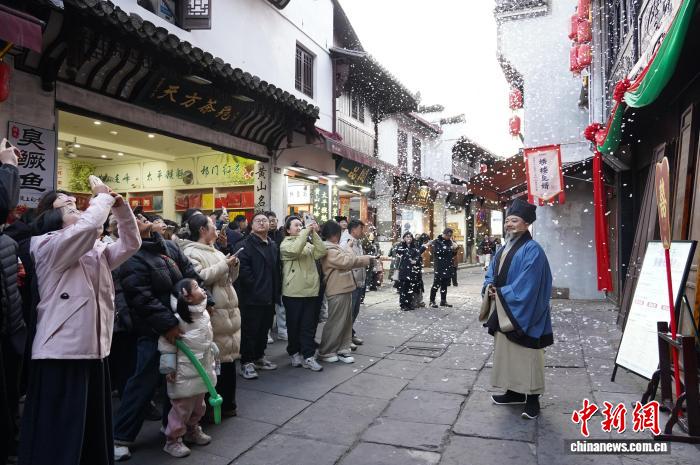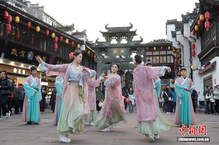 中新网合肥1月1日电 ( 张俊 程梦君 任俊翔)抛绣球、听说书、练五禽戏,与扮成状元、说书人、大夫等NPC(非玩家角色)互动。元旦假期,黄山市屯溪区屯溪老街“来屯嬉”沉浸式互动演绎项目颇受欢迎。