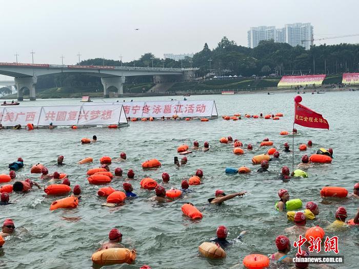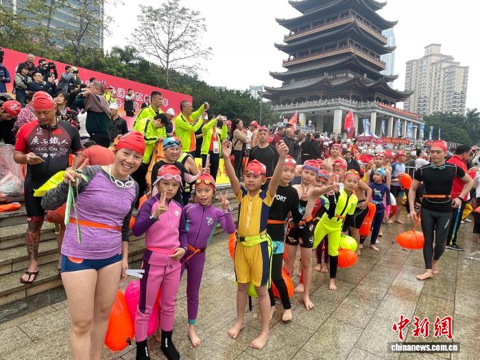 本次活动参与者年龄最小为4岁,最年长为86岁。现场随处可见家庭同行、朋友结伴,不少人头戴红色泳帽或佩戴新年饰品,为新年的邕江增添了一抹亮色。
