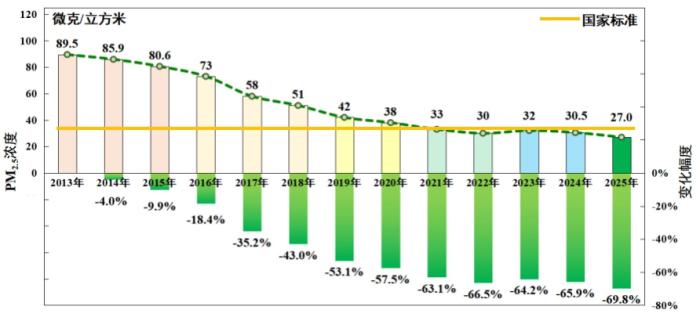 北京市开展大气污染防治以来,PM2.5保持长期改善趋势,从2013年的89.5微克/立方米,降至2025年的27.0微克/立方米,降幅达69.8%。其中,“十四五”时期,北京市PM2.5年均浓度连续五年达到国家标准并屡创新低,在2021年首次达到国家标准后,2025年较2020年再降三成。经过多年努力,北京市PM2.5已经实现稳定达标。