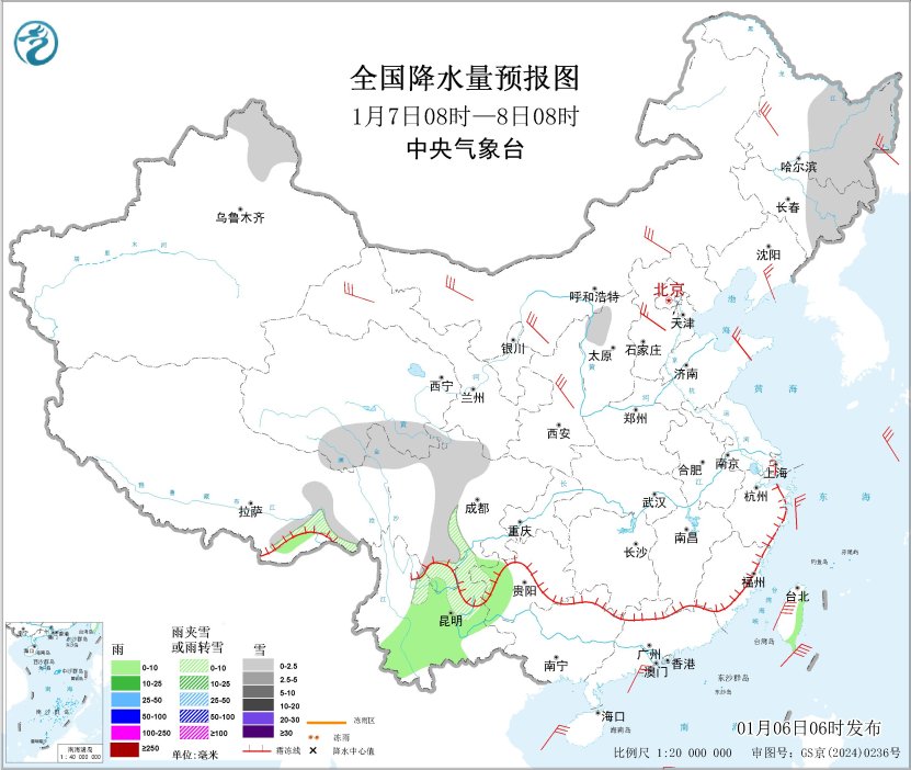 1月7日08时至8日08时,新疆阿勒泰地区、黑龙江东部、吉林东部、西藏东南部、青海南部、山西北部、川西高原北部、四川南部、云南东北部等地的部分地区有小雪或雨夹雪;贵州西部、云南东南部、台湾岛东部等地的部分地区有小雨。内蒙古中西部、黑龙江西部、甘肃西部、陕西北部、河北中部、辽东半岛、山东半岛等地部分地区有4~6级风,阵风7~9级;南海西南部海域将有7~8级、阵风9级的东北风,东海大部海域、台湾海峡、台湾以东洋面、巴士海峡、南海东部和中西部海域将有5~7级、阵风8级的偏北风。