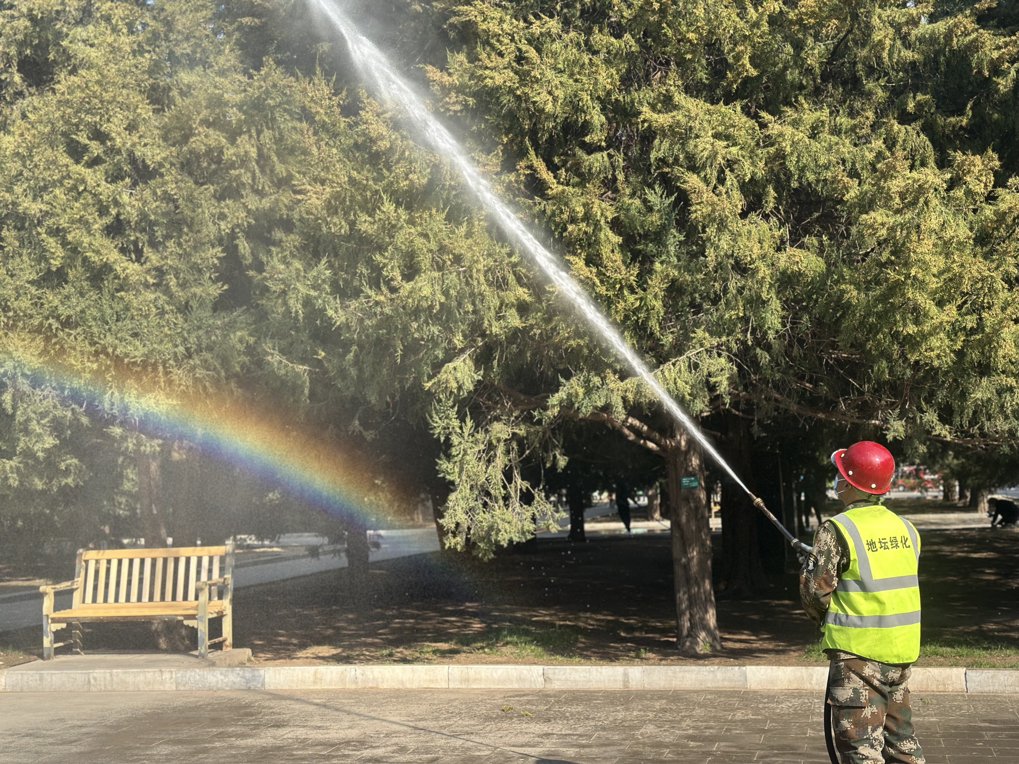 近日,在北京地坛公园,园林绿化人员正对圆柏雄球花枝条整形修剪,高压喷水和地面湿化等加速花粉沉降、降低局部浓度的措施也在同步进行。地坛公园副园长刘洋介绍,在花粉季,公园会结合圆柏的生长特性,定期为其“剪发”和“洗发”。