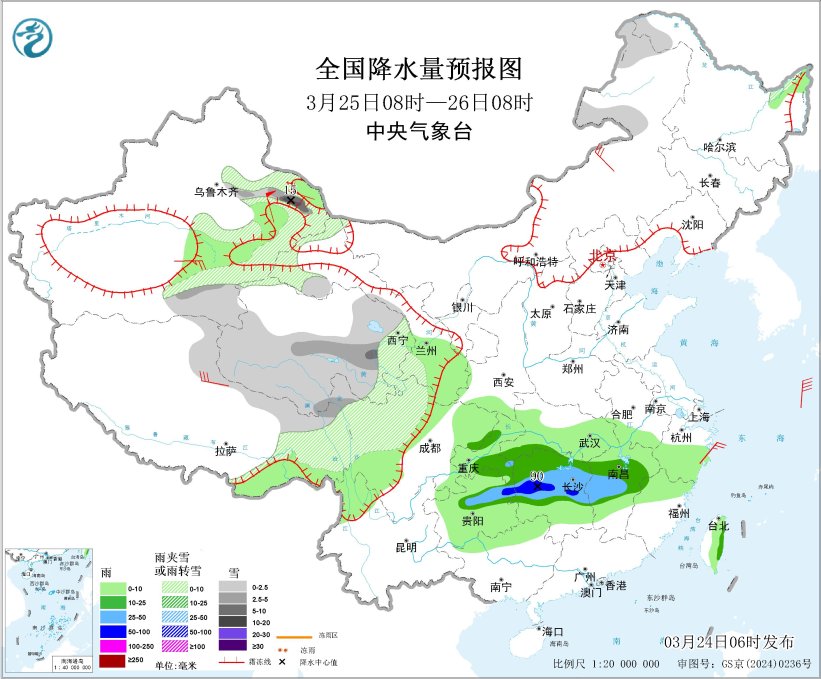 中新网3月24日电 据中央气象台网站消息,昨日,青海、西藏等地部分地区出现雨雪天气,贵州、湖南、江西等地出现中到大雨。未来三天,南方地区多阴雨天气,江南等地部分地区有大雨、局地暴雨,伴有强对流天气,关注对农业生产的影响,并防范次生灾害;青藏高原东部、新疆北部等地多雨雪天气,局地降水较强,关注对交通运输、工程建设、农牧业等的影响。