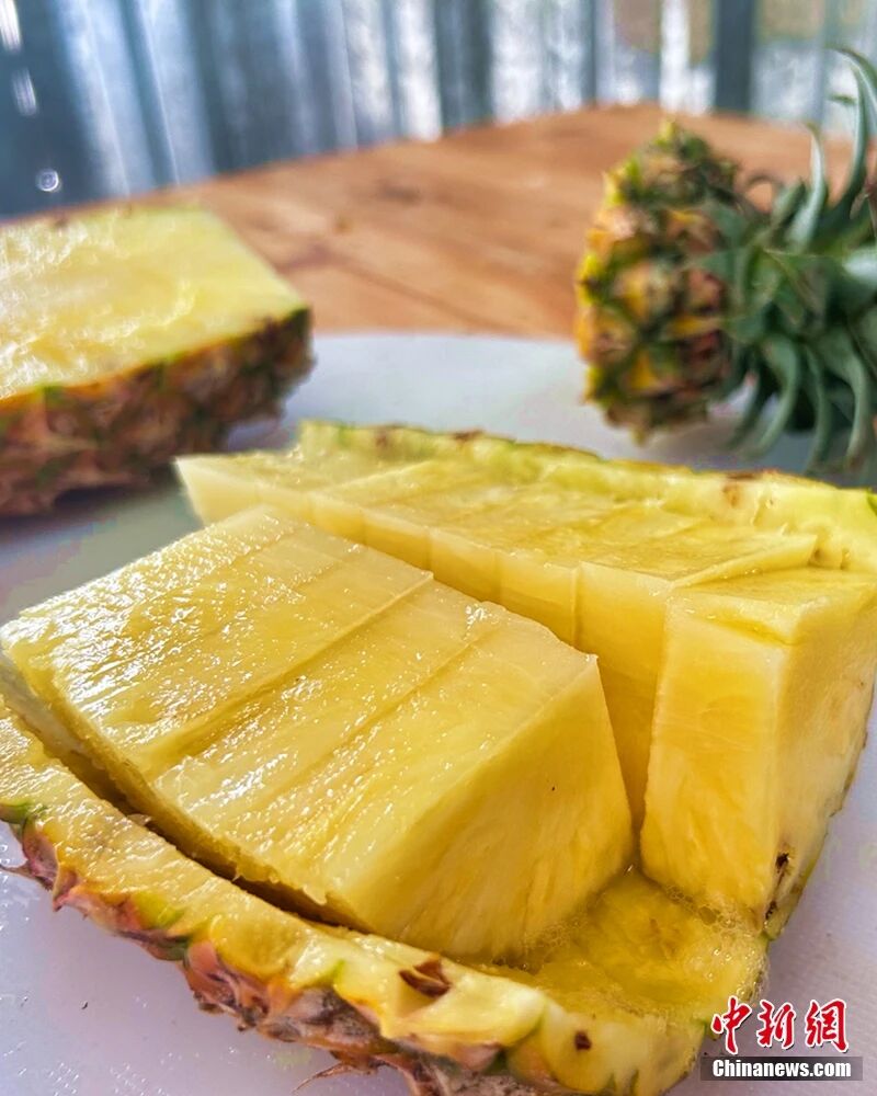 “我们种的凤梨,直接削皮就能吃!”种植地里,多格村农户顺手削开一颗金钻凤梨,金黄的果肉裸露出来,汁水顺着指缝流淌。