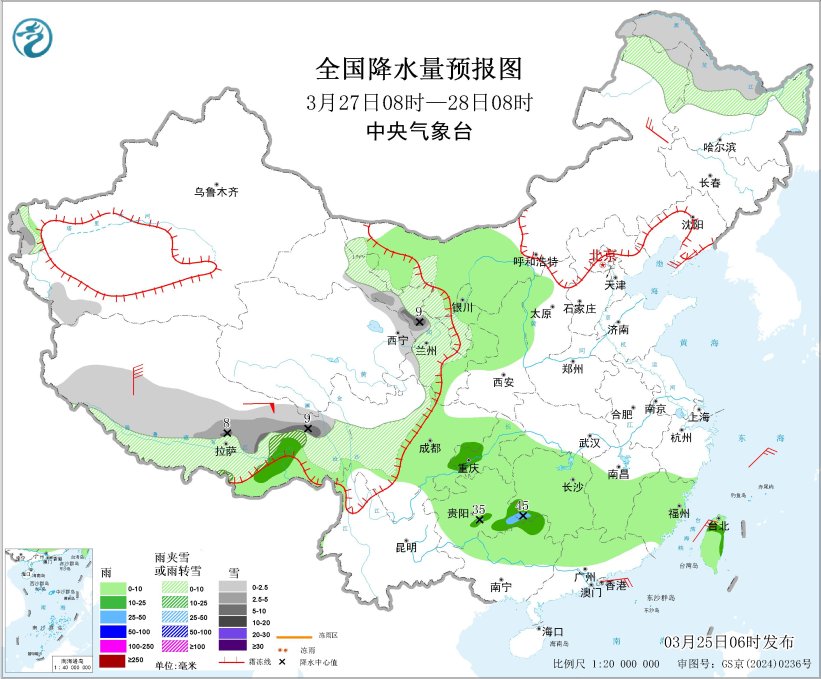 3月27日08时至28日08时,新疆南疆西部山区、西藏南部、川西高原中部、内蒙古西南部和东北部、黑龙江中北部、甘肃河西、宁夏南部等地部分地区有小到中雪或雨夹雪,其中,西藏东南部、甘肃河西等地部分地区有大雪(5~9毫米);内蒙古西部、西藏东南部、四川盆地、重庆、贵州、陕西中北部、江南大部、湖北西南部、华南北部、台湾岛等地部分地区有小到中雨,其中,湖南西南部、贵州南部等地部分地区有大雨(25~45毫米)。内蒙古东北部、辽东半岛等地部分地区有4~6级风,西藏东部地区有7~8级风。