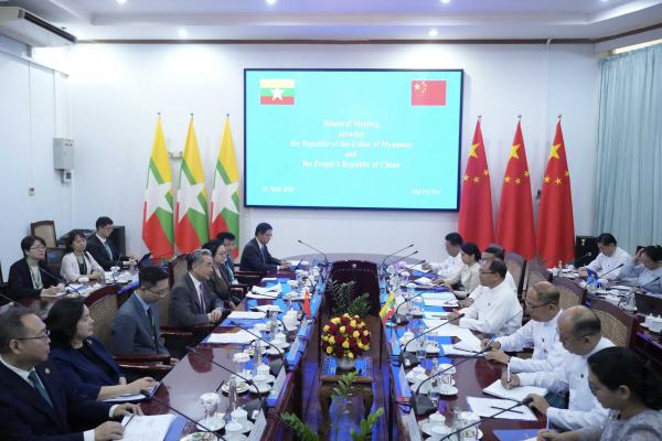 当地时间2026年4月25日,中共中央政治局委员、外交部长王毅在内比都同缅甸外长丁貌瑞举行会谈。