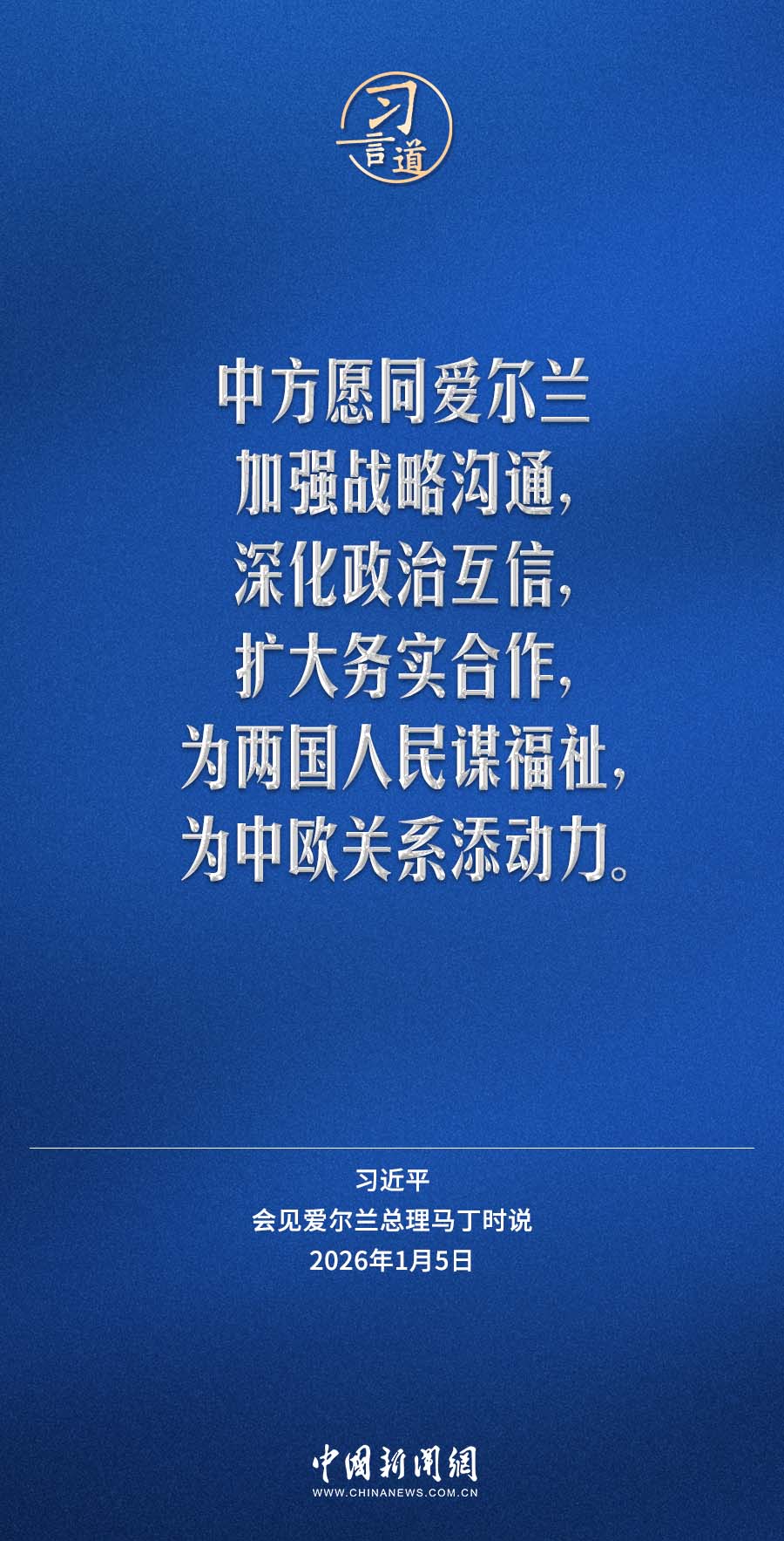 导读:1月5日,国家主席习近平在北京人民大会堂会见来华进行正式访问的爱尔兰总理马丁。习近平指出——