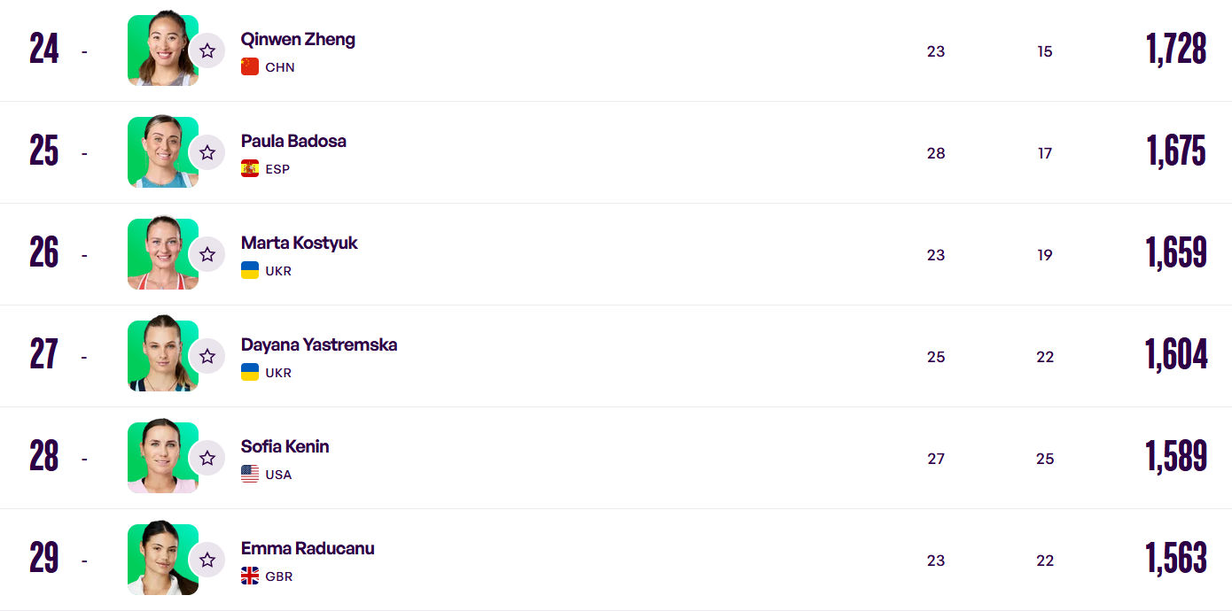 目前,在WTA女单排名中,郑钦文位列第24。由于伤病,她的位次可能继续下降。