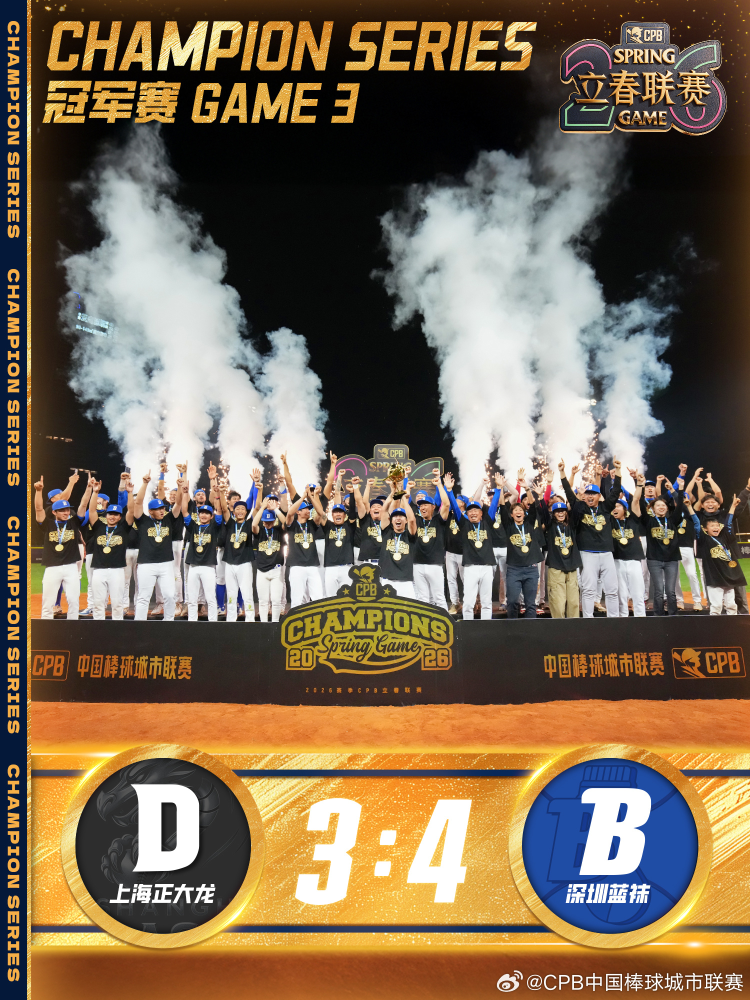 中新网北京2月2日电 CPB(Chinese Professional Baseball)中国棒球城市联赛立春联赛于2月1日晚收官。在总决赛第三战中,深圳蓝袜队4:3险胜上海正大龙队,从而以系列赛总比分2:1夺冠,成为CPB联赛首支冠军球队。