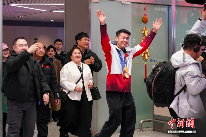 中新网哈尔滨3月16日电(记者 王妮娜)16日,米兰冬奥会速度滑冰男子1500米冠军宁忠岩回到家乡黑龙江,在哈尔滨太平国际机场受到热烈欢迎。这位为中国代表团斩获1金2铜的名将,用沉甸甸的奖牌与父母分享这他的喜悦和荣耀。