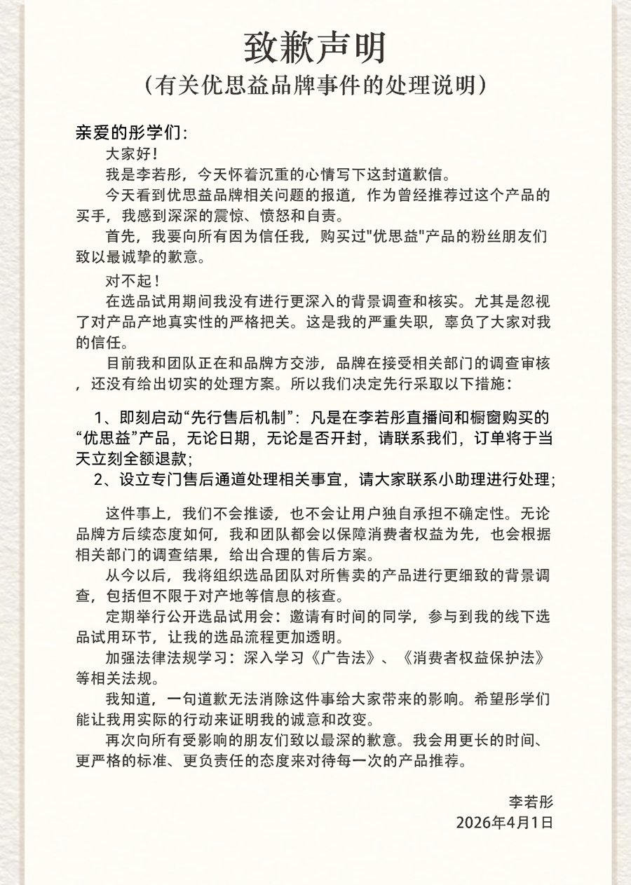 “作为曾经推荐过这个产品的买手,我感到深深的震惊、愤怒和自责。”4月1日,演员李若彤致歉称,在选品试用期间自己没有进行更深入的背景调查和核实,尤其忽略了对产品产地真实性的严格把关。她宣布即刻启动“先行售后机制”:凡在其直播间和橱窗购买的产品,无论日期、是否开封,订单将于当天立刻全额退款。