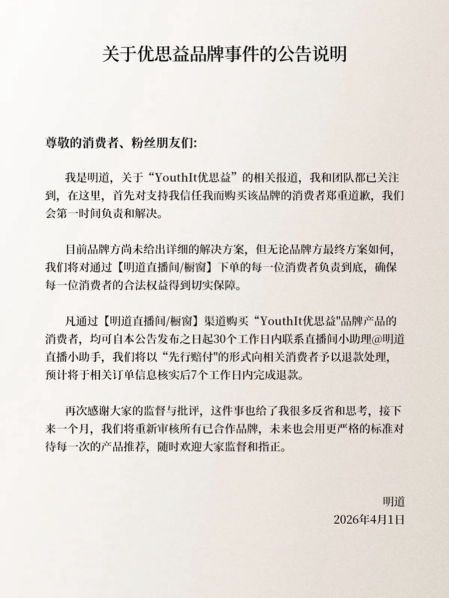 演员明道承诺,凡通过其直播间、橱窗购买该品牌产品的消费者,均可自公告发布之日起30个工作日内联系助理退款。时尚博主章小蕙通过“玫瑰是玫瑰”账号发布类似道歉说明:自公告发布起15个工作日内联系客服,团队将以“先行赔付”的形式于订单核实后7个工作日内退款。
