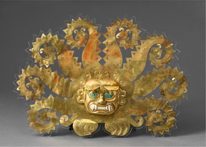 关于“王的宝藏”部分,谭晓玲介绍了一件冠饰:它最引人注目的就是8根锯齿状的章鱼触角,从中心的脸庞向四周辐射,这个辐射图案或许与太阳崇拜有关,代表着光明和秩序。