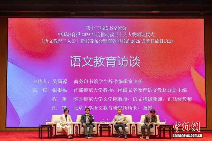 第十三届读书交流会暨中国教育报2025年度推动读书十大人物颁证仪式日前在中国国际出版交流中心举行,商务印书馆2026读者开放日启动。现场发布了《商务印书馆全民阅读推荐书目》(简称“推荐书目”)100种,举行《语文教育三人谈》新书首发式。