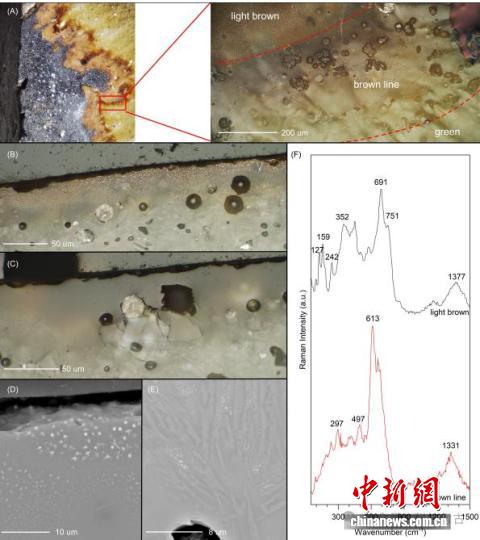 运用扫描电子显微镜、微区X射线荧光光谱、拉曼光谱等分析方法,联合团队对5件东晋至南朝时期的越窑点彩青瓷残片展开显微分析,在微尺度上揭秘早期彩瓷“烧前釉上彩”技术及一种特殊的三氧化二铁晶体。