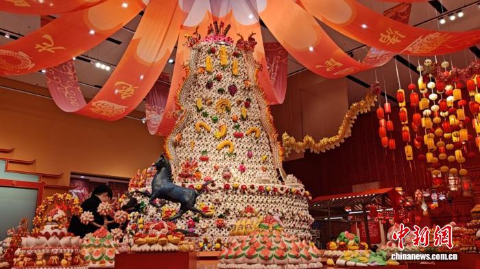 “食为天”展区中,一座高4.5米、直径3.6米的花馍“大鼓枣山”极为醒目。澄城面花是陕西省非遗代表性项目,俗称花馍。这件花馍作品来自陕西省澄城县红云花馍农民合作社,以“天圆地方”为理念,融入花卉、生肖等丰富元素。合作社社长惠相楼介绍,包括他在内18个人做了一个月才完成。