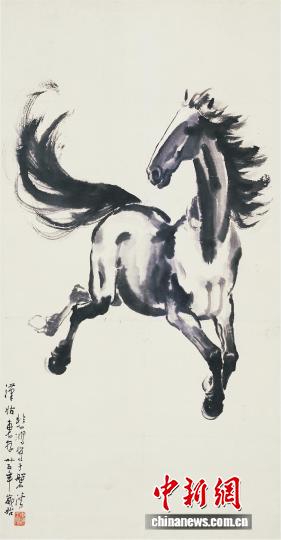 展品中,中国现代美术奠基人徐悲鸿的《饮马图》与《奔马图》动静相宜,分别捕捉了骏马饮水的静谧瞬间与四蹄腾跃的飞奔之姿。岭南画派创始人之一高剑父的《马》融汇中西,笔法苍劲;杨善深的《白马》则形神兼备,拙朴生趣。