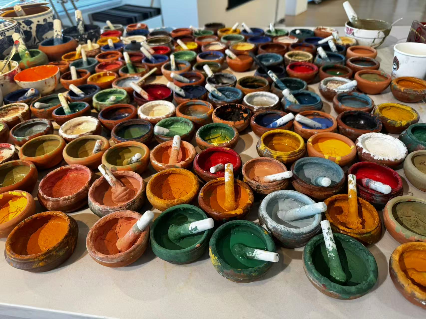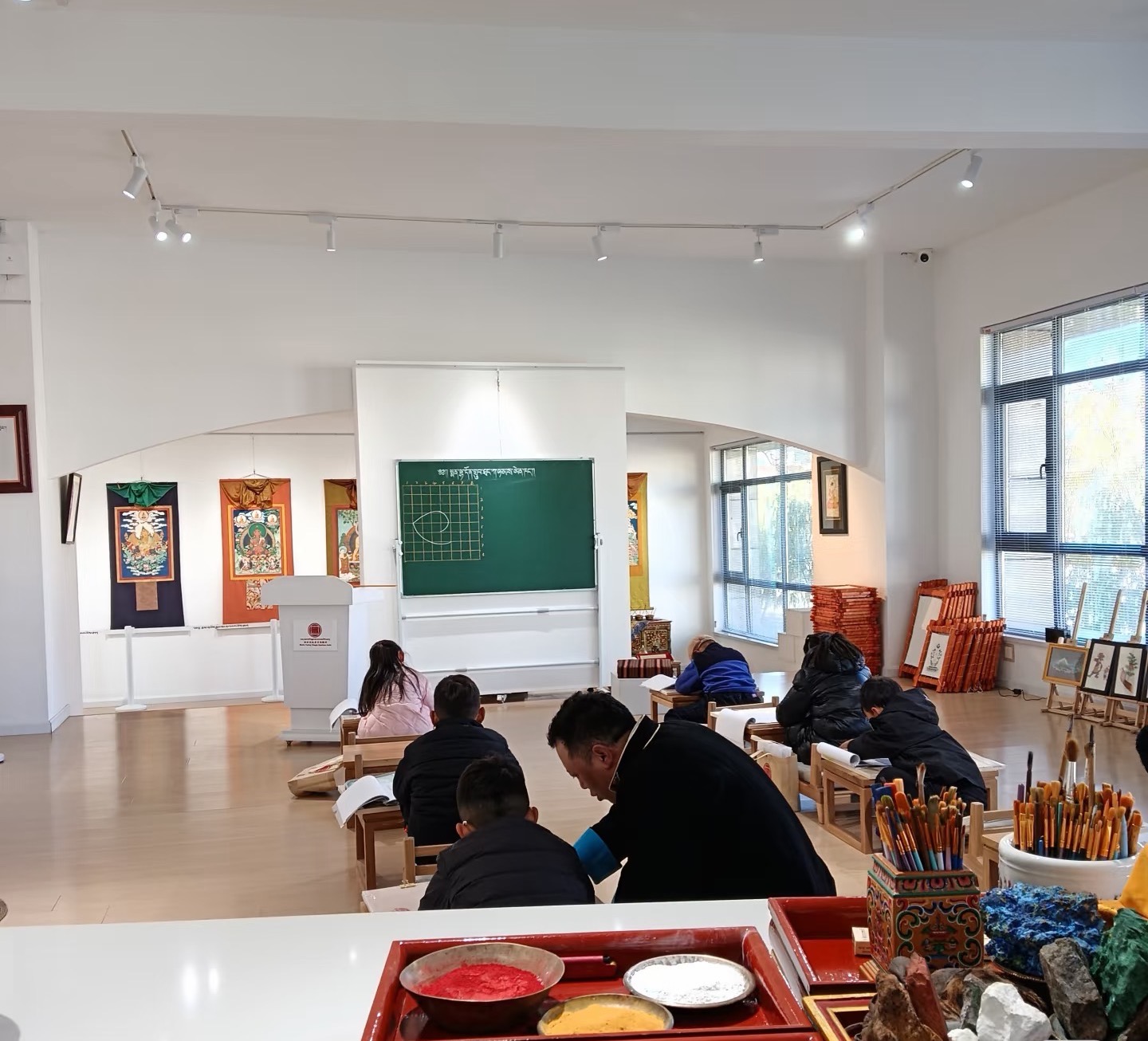 颜料则源自天然矿石和植物。工作台上的小陶罐里,装着精心研磨的孔雀石、青金石、朱砂等。“机器磨的颗粒不均匀,画不出有生命力的色泽。”体验馆画师群培说,手工研磨颜料至今仍是入门必修课。