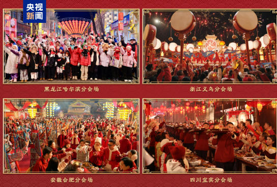 四地分会场各具风韵,从冰天雪地到长江之滨,从科创沃土到商贸新城,在新大众文艺的创新创造里展现各地年景。哈尔滨分会场融合表演唱、交响乐、芭蕾舞等表演形式,以故事化表达串联起城市地标,带观众沉浸式感受“东北老铁”的热情豪爽,传递“冰雪暖世界”的独特魅力。义乌分会场在全球数贸中心设立主舞台,表演融入拨浪鼓、婺剧、迎龙灯等地方元素;在热情四溢的歌舞中,中外文化相汇交融,四海畅联、八方通达的气象扑面而来。合肥分会场的水墨舞蹈、黄梅戏等接连登场,映照出徽风皖韵的风情;在主舞台骆岗公园上空,低空飞行器列阵翻飞,碰撞出科技与人文的璀璨火花。宜宾分会场以“万里长江第一城”的浩荡江景为幕,民俗活动“请春酒”贯穿全场,三江六岸欢歌笑语,家人围坐、燃面飘香、喜乐满堂。