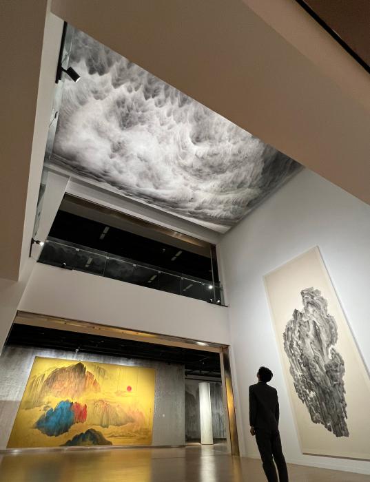 展览现场,近百件作品在现代展厅中铺陈开来,彻底改变了传统案头观赏的方式。从悬置天顶的《天元》到长达二十六米的弧形长卷《若出其中》《若出其里》,作品以巨大的体量主动介入建筑空间,引导观众调整观看距离与仰角,在物理与心理层面形成双重震撼,构建出浑然天成的“鸿蒙之境”,让艺术精神与科技理性深度交融,为科创高地增添了温润的文化温度,真正实现了“笔墨融科技,山水入新境”的美学探索。