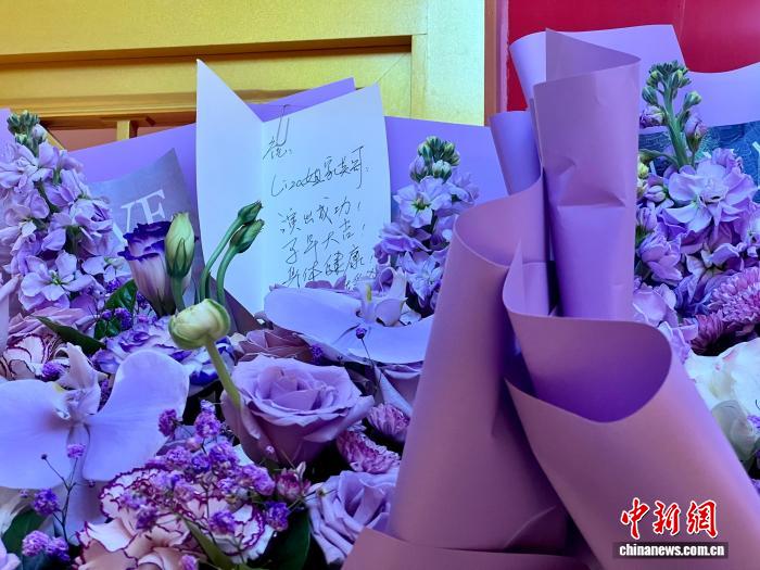中新社记者在现场看到,不少观众慕名而来,剧院外摆放着友人和戏迷赠送的花篮,写有“演出成功”等祝福语。