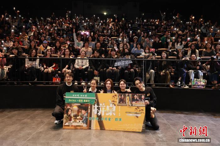 中新网上海3月13日电 (记者 王笈)电影《拼桌》12日晚在上海举行“好好吃,好好爱”主题首映礼及路演活动。编剧兼导演吴靖携领衔主演王传君、江疏影,主演李雪琴、郑云龙等亮相映后互动环节,分享创作心路。