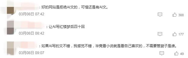 有报道称,社交媒体上的AI写作暴富噱头,让网文圈变了天。有网文作家坦言,自己日更近万字已是极限,但在AI几分钟几万字面前,直接被降维打击。评论区里,网友议论纷纷,“AI写的文章空洞乏味,没有个人感情”“有一本AI文火的吗”……